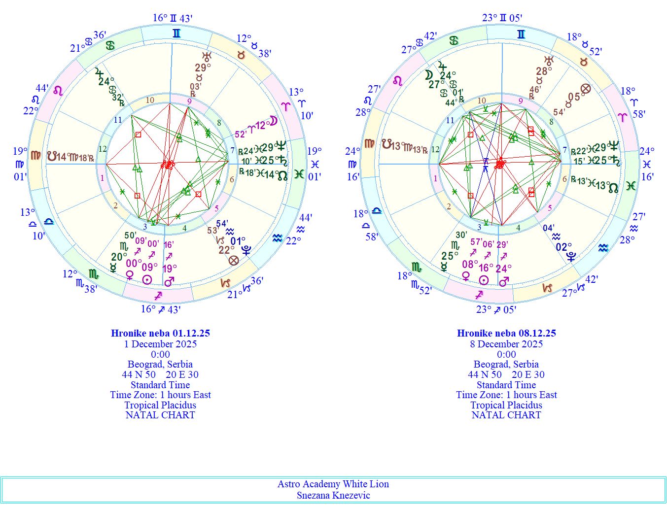 Petak počinje pod svetlošću punog Meseca u Blizancima, koji nas obasjava odmah posle ponoći. Ovo je jedan od onih lunacija koje razbude i srce i um, koje nam ne daju da spavamo dok ne osvestimo šta je to što želimo da izgovorimo, naučimo, pustimo ili razjasnimo. Blizanci nose energiju misli, reči, komunikacije i mladalačke radoznalosti – i zato ovaj pun Mesec otvara sve ono što je dugo stajalo u tišini. Misli brže teku, osećanja se prelivaju kroz reči, a intuicija želi da priča. Ovo je trenutak velikih spoznaja, malih istina i oslobađajućih razgovora. Kasnije tokom dana, Mesec ulazi u opoziciju sa Marsom u Strelcu i zato će sve što osećamo biti pojačano: i radost, i nervoza, i želja da reagujemo odmah. Ovo je energija koja lako može da odvede u impulsivne reči, brze odluke ili preteranu iskrenost. Zato je važno da napravimo kratku pauzu pre nego što odgovorimo. Ako osetiš da u tebi raste napetost, to je Mars – samo te podseća da usmeriš snagu, a ne da je prospeš na pogrešnu stranu. Kako dan odmiče, pojavljuje se kvadrat sa Saturnom, i tu dobijamo najvažniju lekciju dana: strpljenje. Tek kada usporimo, možemo čuti šta nam pun Mesec zaista poručuje. Saturn traži zrelost, pažnju i odgovornost prema rečima. Ono što kažemo sada ima težinu, a ono što odlučimo može trajati dugo. Zato je petak dan u kojem se oslobađamo od starih misli i obrazaca, ali to radimo mudro i svesno. Pratimo prvi impuls, ali ga filtriramo kroz mir, jasnoću i unutrašnju istinu. Pun Mesec u Blizancima nas poziva da govorimo iz srca, a ne iz straha – i da naučimo da se naša istina čuje najdalje onda kada je izgovorimo mirno.