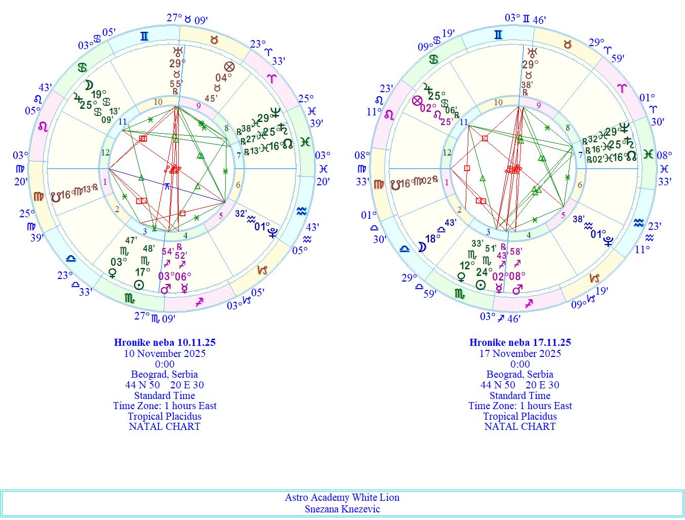 Nakon dinamičnog i strastvenog početka nedelje, sreda donosi trenutak zatišja, ali ne i mira. Na nebu se formira opadajući kvadrat između Meseca u Lavu i Sunca u Škorpionu — aspekt koji uvek nosi unutrašnju napetost između onoga što želimo da pokažemo svetu i onoga što duboko u sebi osećamo. Mesec u Lavu teži da bude viđen, da izrazi srce i pokaže snagu. Sunce u Škorpionu, s druge strane, traži istinu, autentičnost i emotivnu iskrenost, često kroz introspektivne i transformišuće procese. Kada se ove dve energije sukobe, osećamo raskorak između spoljašnje slike i unutrašnje istine. Ovaj dan može doneti blagu emotivnu napetost — kao da ne možemo da pronađemo pravi način da izrazimo ono što osećamo. Ponos, ponavljanje starih obrazaca ili želja da zadržimo kontrolu mogu nas udaljiti od iskrenosti. Ipak, upravo u tom neskladu krije se prilika za rast. Opadajući kvadrat između Sunca i Meseca uvek označava proces oslobađanja — vreme kada shvatamo da ne moramo sve držati pod kontrolom.