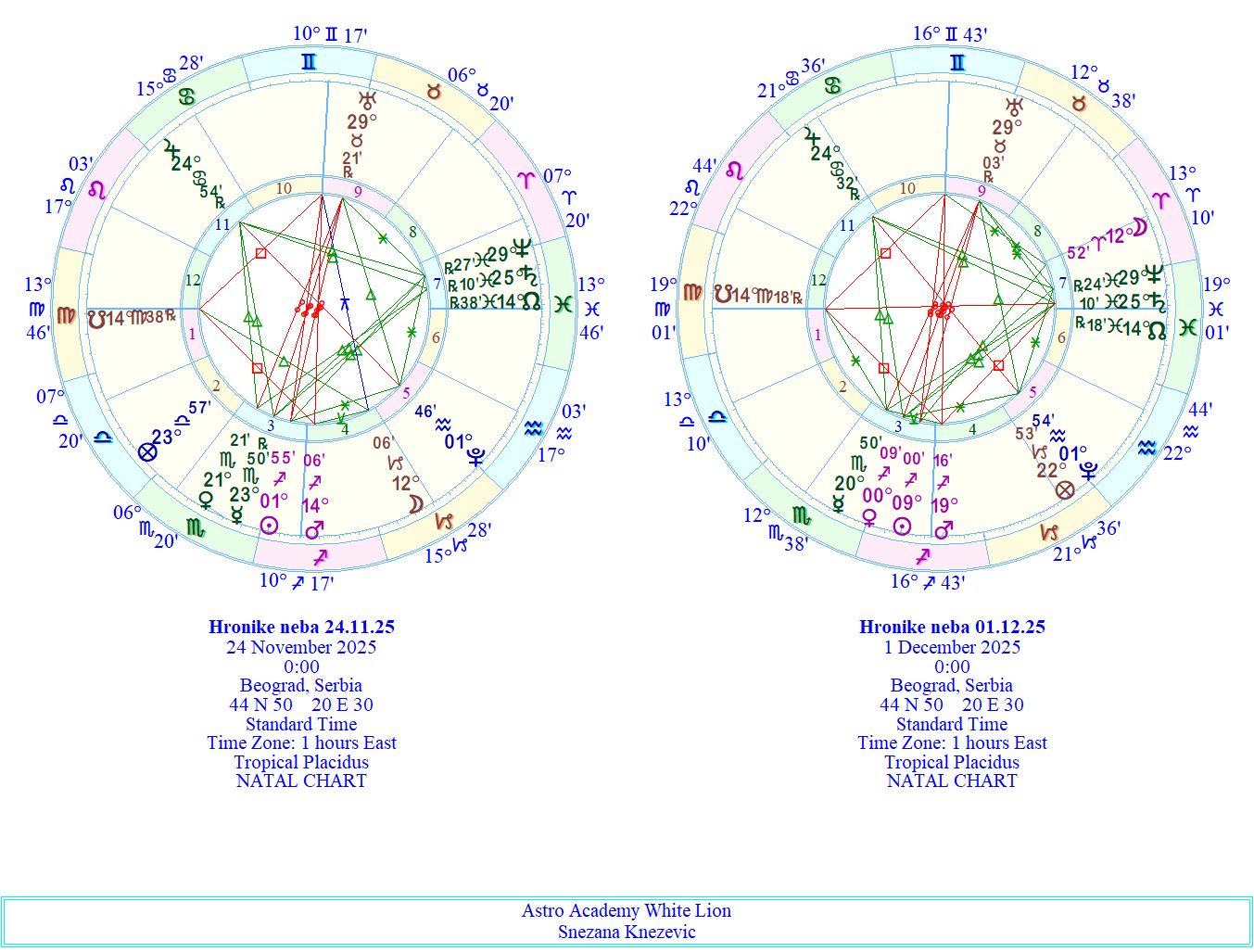 Utorak počinje snažno i intimno. U ranim jutarnjim satima Venera se spaja sa retrogradnim Merkurom u Škorpionu, otvarajući vrata dubljem razumevanju emocija i istina koje su dugo bile neizgovorene. Ovo je aspekt koji izvlači osećanja na površinu – nežno, ali intenzivno. Razgovori koji se danas dogode mogu biti transformišući, iskreni i oslobađajući. Škorpionska energija ne trpi površnost; ona traži srce, traži suštinu, traži istinu koja dira pravo u centar. Kako dan odmiče, Mesec u Jarcu ulazi u niz aspekata koji dodatno oblikuju naš unutrašnji ritam. Njegova opozicija sa Jupiterom u Raku donosi zatezanje između dužnosti i želja, između onoga što moramo i onoga što osećamo. Ovo je trenutak kada se srce preliva, ali razum traži granice. Sekstil Meseca sa Saturnom i Neptunom u Ribama pruža oslonac i mekoću. Saturn donosi zrelost, fokus i unutrašnju strukturu, dok Neptun dodaje intuitivni sloj razumevanja. Razum i intuicija danas rade zajedno, kao dva dela iste istine. Ovo su aspekti koji donose mir usred pokreta, jasnoću usred osetljivosti. Trigon Meseca sa Uranom u Biku unosi iznenadne uvide, potrebu za promenom i energiju osveženja. Mnogi će danas osetiti želju da se oslobode nečega što ih dugo pritiskalo – starog obrasca, sumnje, nezdrave obaveze. To je trenutak kada shvatamo da sloboda počinje od jednog malog, ali hrabrog koraka. Oko podneva Mesec prelazi u Vodoliju, menjajući ton dana, iz ozbiljnosti Jarca ulazimo u sferu mentalne budnosti, originalnosti i unutrašnjeg oslobađanja. Ulazak u ovaj znak odmah nas povezuje sa Plutonom, pa se Mesec spaja sa njim u konjunkciji koja produbljuje sve što osećamo. Ovo je emocionalno buđenje – ali hladno, jasno i beskompromisno. Vodolijski Pluton traži autentičnost bez maske. Istovremeno, Mesec gradi sekstil sa Suncem i Marsom u Strelcu, donoseći talas pozitivne vatre, pokreta, motivacije i energije koja pokreće misao u akciju. Marsov dan uvek je dinamičan, ali današnja kombinacija daje mu posebnu snagu: intuicija je oštra, volja jaka, a um okrenut ka budućnosti.