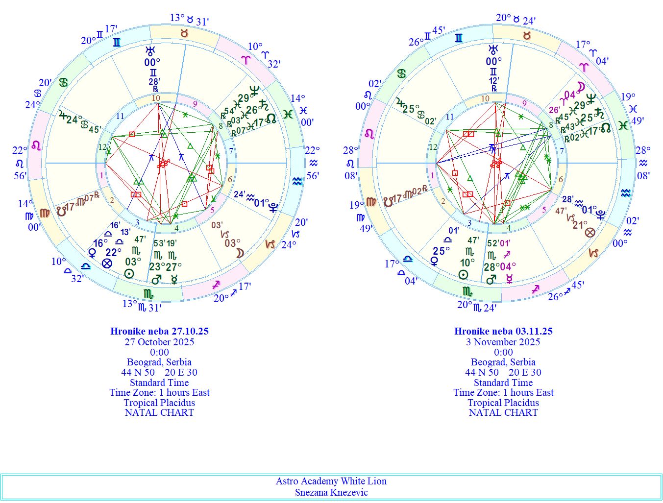 Ipak, glavni aspekt dana je trigon Marsa u Škorpionu i Jupitera u Raku — jedan od najmoćnijih aspekata ove nedelje.To je energija hrabrosti, samopouzdanja i duhovne snage. Mars u Škorpionu budi odlučnost, fokus i volju da idemo do kraja, dok Jupiter u Raku donosi zaštitu, moralnu širinu i emotivni mir. Njihov skladan odnos gradi osećaj da se borimo za ono što volimo, ali bez potrebe za sukobom. To je sila koja gradi, ne razara; pokreće iz unutrašnje vere, ne iz ega. Ako danas učiniš korak prema nekom cilju, znaj da je nebo uz tebe — snaga koju pokrećeš ima korene u srcu. Deluj s verom, ne sa sumnjom. Kad srce i volja rade zajedno, prepreke postaju vrata.
