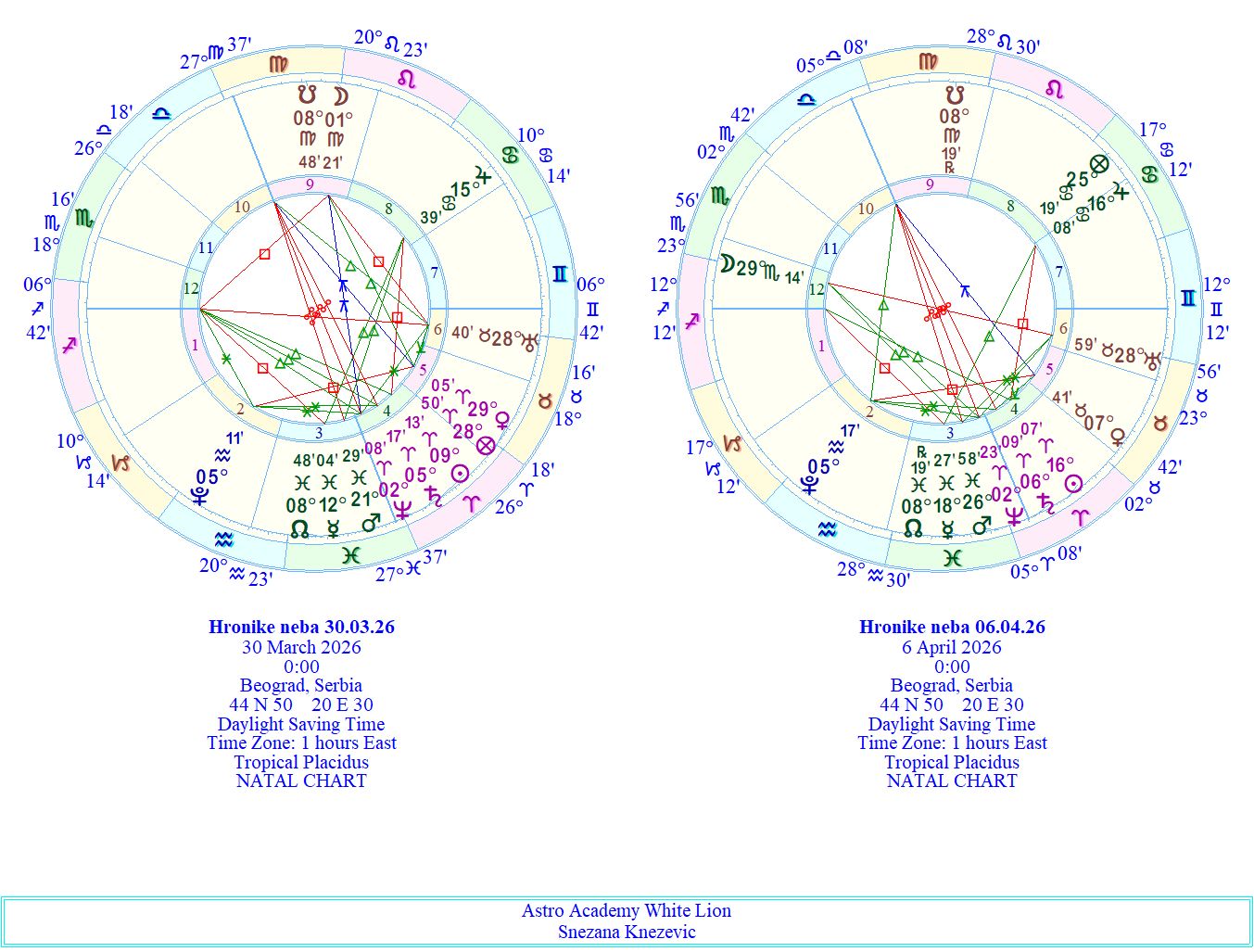 Nedelju završavamo u znatno mirnijem i zaokruženijem tonu, uz dva skladna vodena trigona koje Mesec iz Škorpiona gradi sa Merkurom i Marsom. Nakon intenzivnih i dubokih procesa kroz koje smo prolazili prethodnih dana, sada se otvara prostor za razumevanje, smirivanje i unutrašnju integraciju. Trigon sa Merkurom donosi sposobnost da ono što smo osećali konačno pretočimo u reči jasnije, iskrenije i sa više razumevanja. Ovo je trenutak kada razgovori mogu doneti olakšanje, a uvidi postaju dublji i smisleniji. Istovremeno, trigon sa Marsom daje snagu da emocije ne ostanu samo na unutrašnjem nivou, već da ih pokrenemo i izrazimo na konstruktivan način. Umesto napetosti i impulsivnosti, sada postoji mogućnost da delujemo iz unutrašnje jasnoće i povezanosti sa sobom. Ovo je dan kada intuicija i akcija mogu ići zajedno. Ono što osećamo ne mora nas više preplavljivati, već može postati pokretač koji nas vodi ka konkretnim koracima. Nedelja se tako završava u energiji dubljeg razumevanja, tihe snage i emotivne zrelosti. Sve ono što se pokrenulo tokom nedelje sada može pronaći svoje mesto ne kroz borbu, već kroz prihvatanje i svesno delovanje.